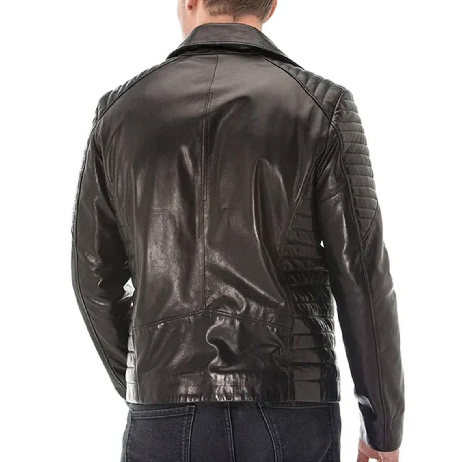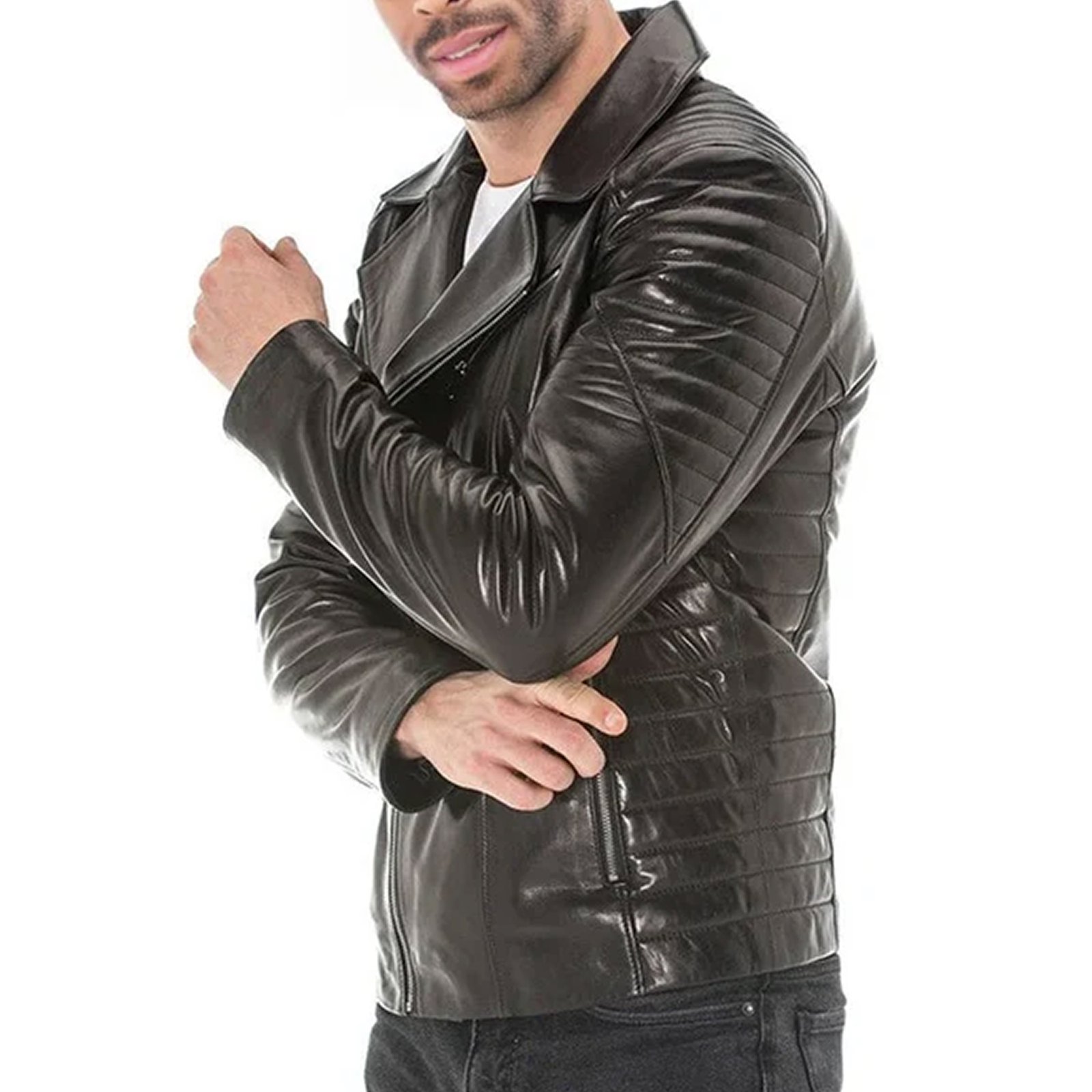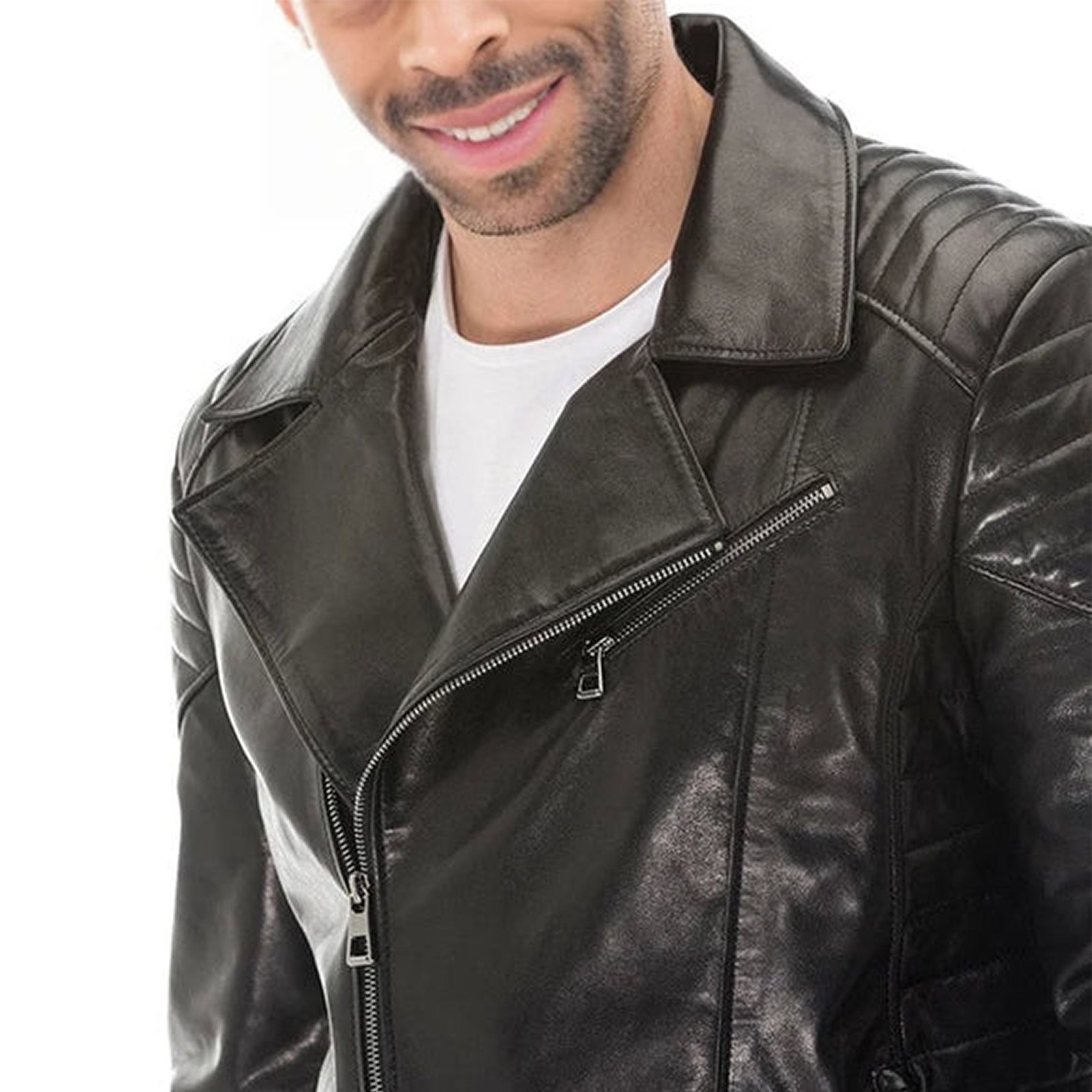 The Vanguard black biker jacket is made from top-tier sheepskin leather. The distinctive padded detailing on the arms and back adds an edgy touch, making this jacket perfect for both casual and formal occasions. With an asymmetrical front zipper and a slim-fit design, it offers a modern, sleek look that exudes confidence and sophistication.